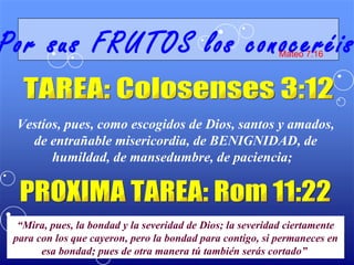 El documento define la benignidad como una cualidad del Espíritu Santo que implica bondad en acción hacia los demás con gracia, ternura y compasión. Explica que Jesús mostró benignidad hacia los necesitados y que los cristianos deben imitar a Dios siendo benignos en palabras y acciones hacia amigos y enemigos.