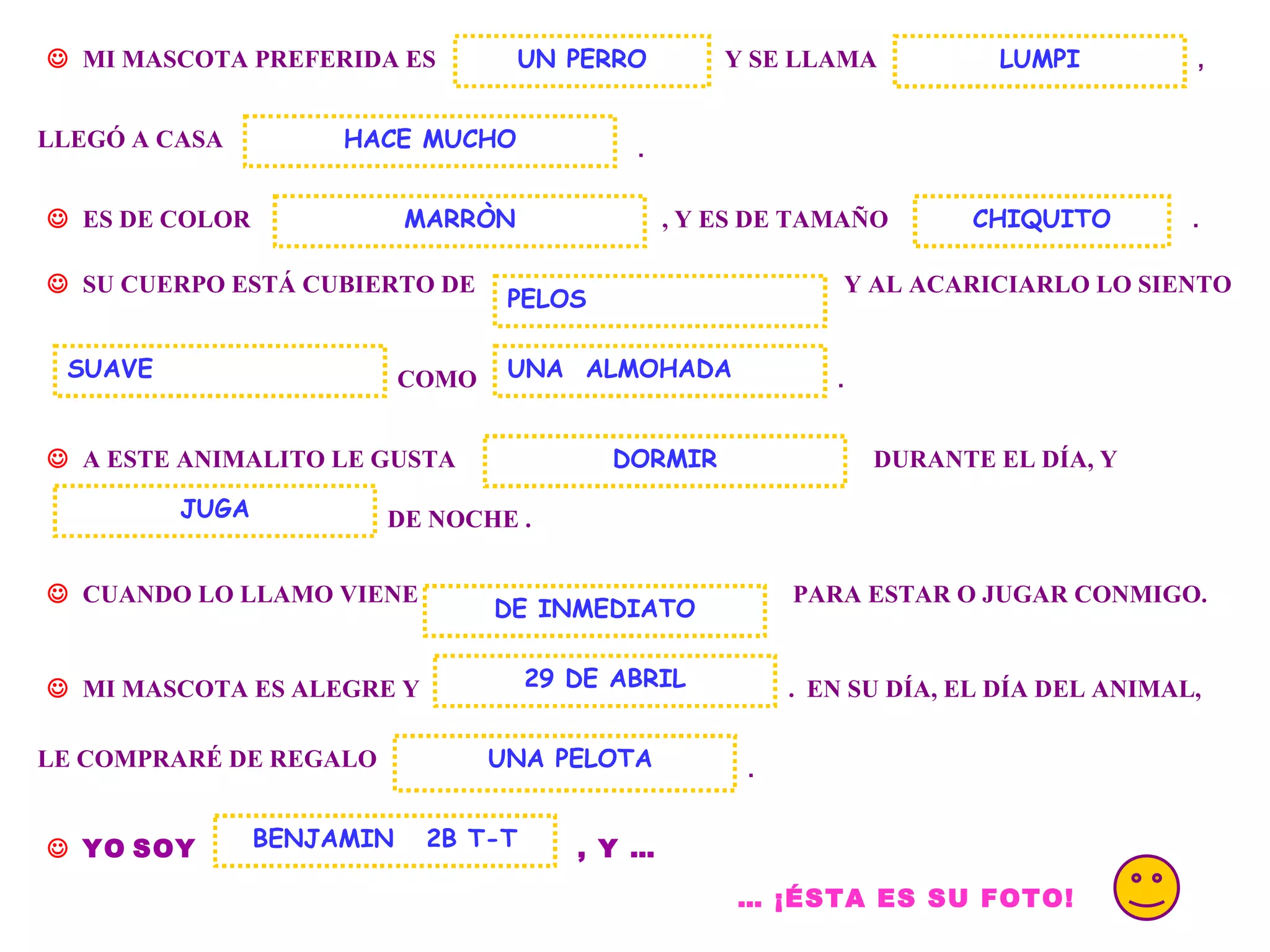 Benjamín presenta a su mascota Lumpi, un perro salchicha de color marrón con pelos suaves. Lumpi llegó a su casa hace mucho tiempo y le gusta jugar durante el día y dormir de noche, viniendo siempre cuando Benjamín lo llama. Benjamín ama a su alegre y cariñosa mascota Lumpi.