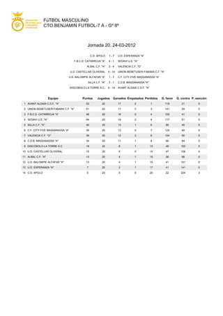 Este documento presenta los resultados de la jornada 20 de la liga masculina de fútbol 7 de la categoría A en Benjamín. Los equipos AVANT ALDAIA C.D.F. "A" y UNION BENETUSER-FABARA C.F. "A" lideran la tabla con 53 y 51 puntos respectivamente. El equipo con peor rendimiento es C.D. APOLO que no ha ganado ningún partido.