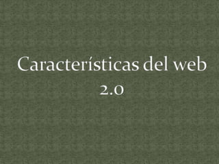 El documento describe las características clave de la Web 2.0, incluyendo permitir el compartir y distribución de información de forma descentralizada entre usuarios, con diseños simples e interactivos. La Web 2.0 facilita que los usuarios sean co-creadores de contenido y que la información esté más en manos de los usuarios.