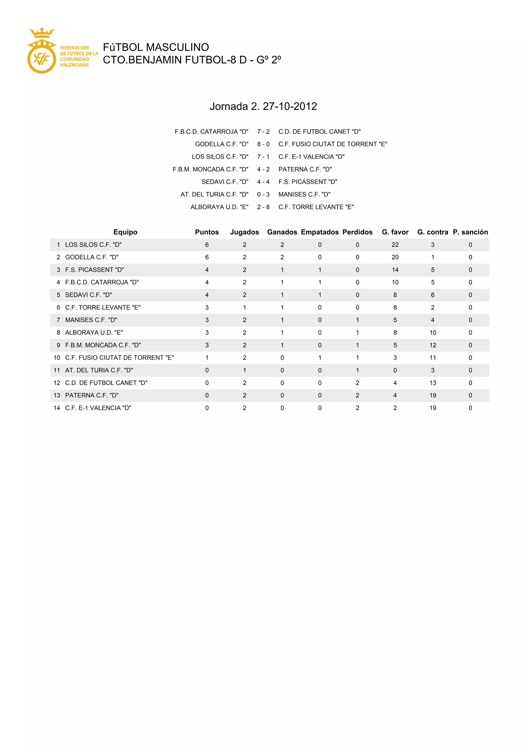 El documento resume los resultados de la segunda jornada del campeonato de fútbol masculino CTO.BENJAMIN FUTBOL-8 D. Se detallan los resultados de los 7 partidos jugados y la tabla de posiciones que lideran Los Silos C.F. "D" y Godella C.F. "D" con 6 puntos cada uno.