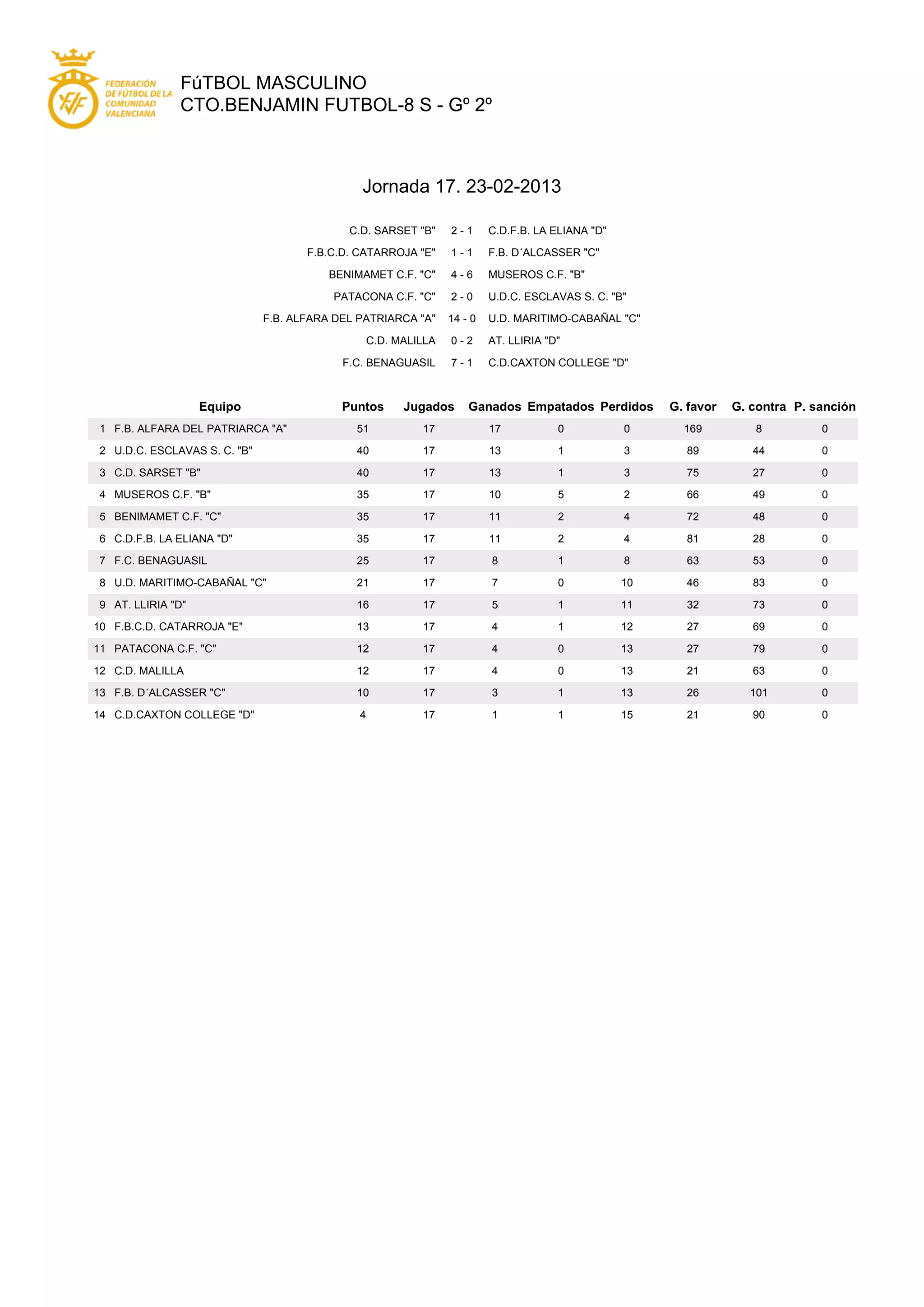 El resumen presenta los resultados de la jornada 17 de la liga de fútbol masculino CTO.BENJAMIN FUTBOL-8 S - Go 2o. Se detallan los resultados de los partidos jugados y la tabla de posiciones liderada por el F.B. ALFARA DEL PATRIARCA 'A' con 51 puntos.