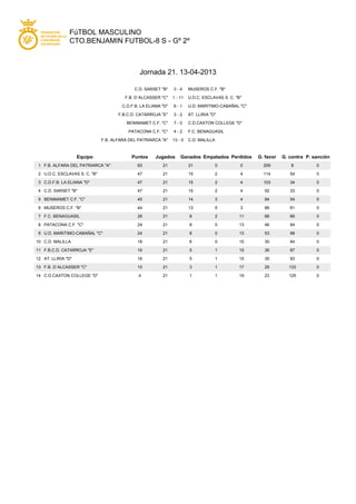 Este documento presenta los resultados de la jornada 21 de la liga de fútbol masculino CTO.BENJAMIN FUTBOL-8 S. En esta jornada, el F.B. ALFARA DEL PATRIARCA "A" ganó 13-0 al C.D. MALILLA y lidera la tabla con 63 puntos, mientras que el U.D.C. ESCLAVAS S. C. "B" y el C.D.F.B. LA ELIANA "D" comparten el segundo puesto con 47 puntos cada uno. El documento también incluye