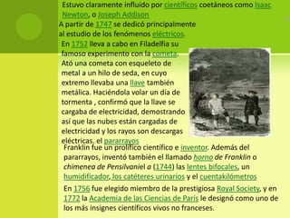 Benjamin Franklin fue un político, científico e inventor estadounidense que nació en 1706 en Boston y murió en 1790 en Filadelfia. Se destacó por sus descubrimientos científicos como el pararrayos y las lentes bifocales, y jugó un papel fundamental en la fundación de Pensilvania y el proceso de independencia de los Estados Unidos, ayudando a redactar la Declaración de Independencia y la Constitución estadounidense.