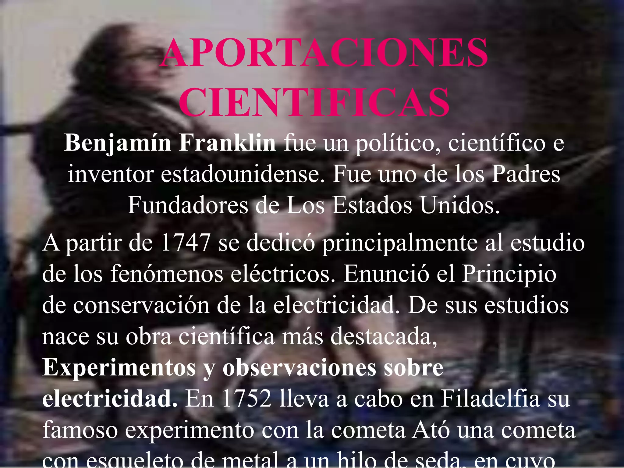 Benjamín Franklin fue un científico e inventor estadounidense que realizó importantes contribuciones científicas en el campo de la electricidad en el siglo XVIII. Llevó a cabo experimentos pioneros sobre electricidad y enunció el Principio de conservación de la electricidad. Su famoso experimento con una cometa en 1752 le permitió crear el pararrayos, uno de sus inventos más importantes. Franklin fue también inventor de otras innovaciones como las lentes bifocales y el cuentakilómetros.