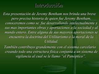 Este documento presenta a Jeremy Bentham, filósofo inglés del siglo XVIII conocido como el padre del utilitarismo. Explica que Bentham desarrolló la doctrina del utilitarismo, la cual sostiene que los actos deben juzgarse según el placer o dolor que producen en las personas. También contribuyó al diseño del sistema carcelario moderno con su idea del panóptico. Finalmente, resume algunos de los principios clave del utilitarismo como maximizar la felicidad del mayor número y evaluar las acciones en función de