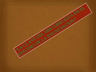 Este documento resume las ideas principales de Emile Benveniste sobre la enunciación y el enunciado. Benveniste sostiene que el conocimiento lingüístico es indispensable para una teoría de los discursos sociales. Define la enunciación como la especificidad que se le da a una palabra y cómo tiene un significado y sentido. Explica que la enunciación se refiere a la lengua en sus diferentes realizaciones orales y escritas y que es lo que ya no es, solo existió por un instante fugaz e inexistente. Finalmente, señ