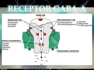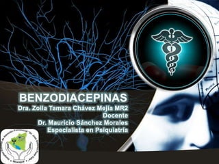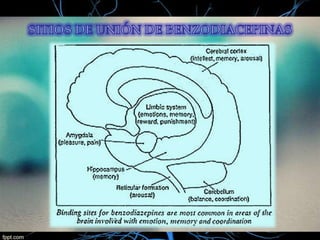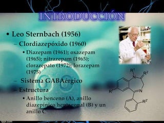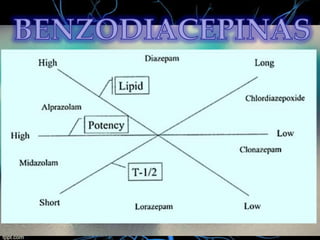 1) El documento describe las características farmacocinéticas y farmacodinámicas de las benzodiacepinas, incluyendo su absorción, distribución, metabolismo y eliminación, así como sus mecanismos de acción, indicaciones y efectos adversos. 2) Se clasifican las benzodiacepinas según su vida media, estructura química y propiedades terapéuticas principales como ansiolíticas, hipnóticas o anticonvulsivantes. 3) También se detallan factores que modifican la acción de