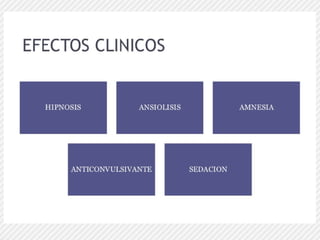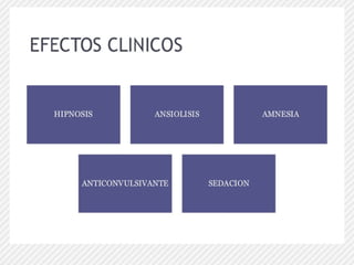 El documento resume las propiedades de varias benzodiacepinas como el midazolam y el diazepán. Actúan potenciando el efecto del GABA en el cerebro para producir efectos ansiolíticos, hipnóticos, miorrelajantes y anticonvulsivantes. Se metabolizan en el hígado y se excretan principalmente en la orina. El midazolam se usa comúnmente para sedación y el diazepán para tratar la ansiedad y convulsiones. Ambos tienen contraindicaciones como la hipersensibilidad y deben us