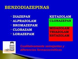 Este documento describe las propiedades y efectos de varios benzodiacepinas como el diazepam, alprazolam y bromazepam. Potencian los efectos del GABA en el cerebro causando sedación, reducción de la ansiedad e hipnosis. Tienen efectos en el sistema respiratorio, cardiovascular y muscular. Se metabolizan en el hígado y su tiempo de vida media puede verse afectado por otras drogas. Pueden causar dependencia física y síntomas de abstinencia al suspender su uso.