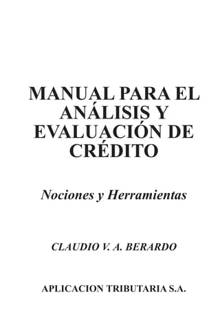 Este manual presenta conceptos y herramientas para el análisis y evaluación de crédito. Explica el rol de los bancos en administrar recursos financieros y atender necesidades financieras mediante préstamos. Detalla el proceso de evaluación de riesgo crediticio, incluyendo políticas de crédito, diagnóstico, factores de riesgo y herramientas como análisis de estados contables e información cualitativa. El objetivo es brindar elementos para que los analistas de crédito desarrollen las habilidades necesarias para