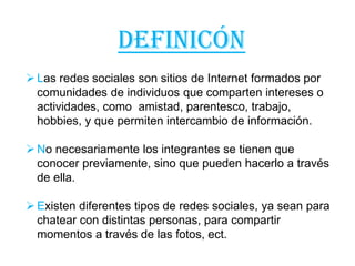 Las redes sociales son sitios web que permiten a las personas conectarse e intercambiar información. Existen diferentes tipos de redes sociales como Facebook para compartir actualizaciones de estado y fotos, Instagram para compartir fotos y videos, y Twitter para enviar mensajes cortos. Cada red social tiene características únicas que permiten a los usuarios interactuar y compartir contenido de diferentes maneras.