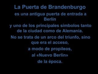 Berlín es una ciudad moderna con una rica historia marcada por la Segunda Guerra Mundial. Algunos de los lugares más importantes para visitar incluyen la Puerta de Brandenburgo, la Columna de la Victoria, el Checkpoint Charlie y el Muro de Berlín, el Palacio de Charlottenburg, el Memorial del Muro de Berlín, el Monumento del Holocausto, la Gendarmenmarkt, el Reichstag, la Catedral de Berlín, la Torre de Televisión en Alexanderplatz y la Potsdamer Platz.