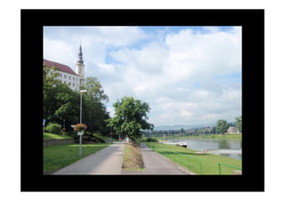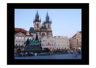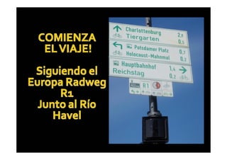 Este documento describe un viaje en bicicleta de Berlín a Praga realizado entre el 30 de julio y el 7 de agosto. El recorrido de unos 560 km pasa por ciudades como Postdam, Wittenberg, Dresde y Ústí nad Labem, siguiendo en parte el río Elba. El viaje concluye en la ciudad de Praga, donde se pueden visitar lugares emblemáticos como el reloj astronómico y la Casa Danzante de Frank Gehry.