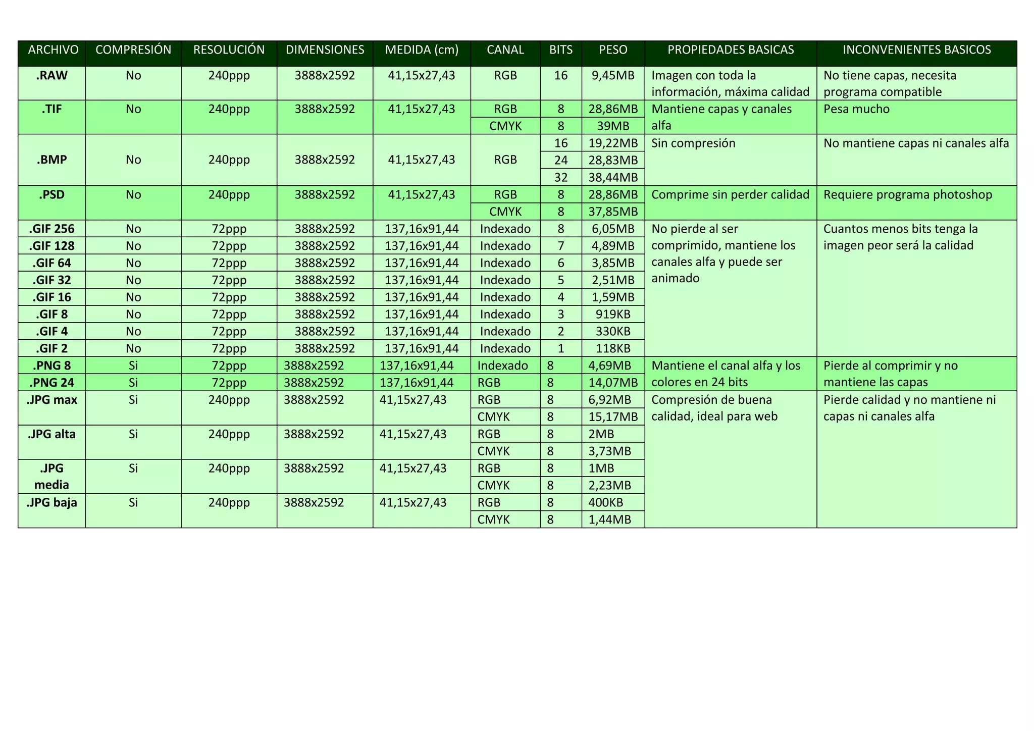 Este documento resume las propiedades básicas y los inconvenientes de los formatos de archivo más comunes para imágenes fijas, incluyendo .RAW, .TIF, .BMP, .PSD, .GIF, .PNG y .JPG. Explica las diferencias entre los formatos en términos de compresión, calidad, capacidad de almacenar capas y canales, tamaño de archivo resultante y compatibilidad con programas de edición de imágenes.