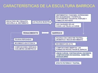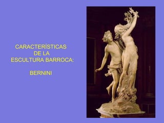 El documento describe la escultura barroca de Bernini, en particular su obra Éxtasis de Santa Teresa. Presenta la escena escenográfica en la que Santa Teresa flota sobre una nube en el altar de una capilla, siendo atravesada por un ángel. Bernini usa líneas curvas y dinámicas, así como efectos de luz y sombra, para capturar el éxtasis místico de Santa Teresa de una manera que parece física y teatralmente emotiva.