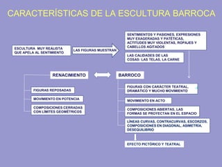 El documento describe las características de la escultura barroca, enfocándose en las obras de Bernini. El Barroco se caracteriza por composiciones abiertas y dinámicas, con figuras en movimiento que expresan pasiones de forma exagerada. Bernini destacó por plasmar el movimiento en mármol de forma realista y dramática, captando estados anímicos y emociones. Sus obras más representativas incluyen el Éxtasis de Santa Teresa y el rapto de Proserpina, mostrando figuras en tensión en composiciones