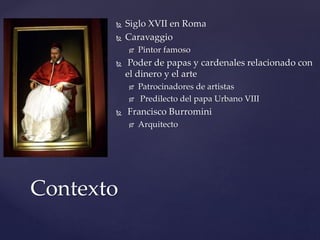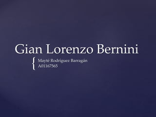 Gian Lorenzo Bernini fue un escultor y arquitecto italiano del siglo XVII en Roma. Desde muy joven impresionó al papa con su talento artístico y fue nombrado caballero a los 20 años. Una de sus obras más famosas fue "El éxtasis de Santa Teresa", la cual representa el éxtasis místico de Santa Teresa de Ávila a través de una intensa composición dramática y movimiento del cuerpo.