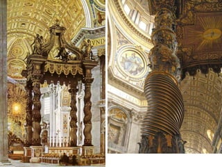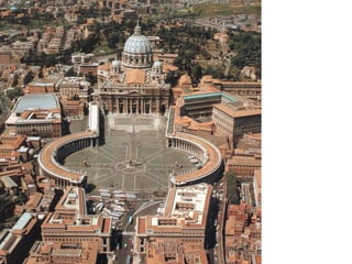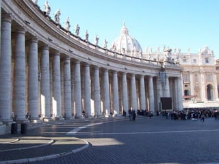 El documento menciona varias obras de arte y esculturas clásicas y religiosas ubicadas en la plaza de San Pedro en el Vaticano, incluyendo "Apolo y Dafne", "El rapto de Proserpina", esculturas de David, Longinos y cardenales, y pinturas como "Éxtasis de Santa Teresa" de Bernini y "Matanza de los Inocentes" de Guido Reni.