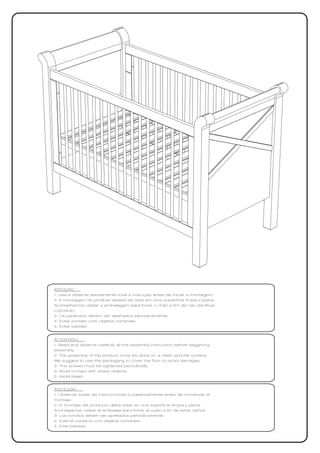 El documento es una instrucción de montaje para un berço o cuna de 130x60 cm, que requiere el ensamblaje de dos personas y toma aproximadamente 30 minutos. Se enumeran las herramientas necesarias, como una llave y un martillo, y se incluyen detalles sobre las piezas de hardware requeridas. Además, se indica que una línea en el lateral del berço señala la altura máxima permitida para el colchón.