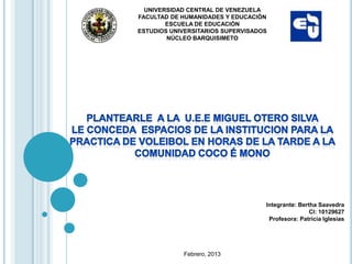 La comunidad de Coco e Mono solicita a la Institución Educativa Miguel Otero Silva ceder sus espacios deportivos dos días a la semana por la tarde para que los estudiantes practiquen voleibol. Esto mejoraría la calidad de vida de la comunidad al disminuir el tiempo libre y focos de problemas sociales, además de fomentar la unidad entre la escuela y comunidad. Se propone diseñar el proyecto considerando las necesidades de la comunidad y elevar la participación de todos los involucrados.