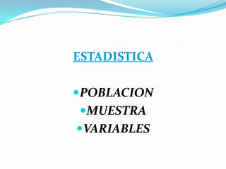 El documento describe conceptos estadísticos como población, muestra, variables y tipos de variables. Explica que la estadística analiza datos para presentarlos de forma organizada y útil. Luego presenta un ejemplo de encuesta a 10 alumnos midiendo edad, estatura y rendimiento escolar como variables cuantitativas y cualitativas. Finalmente, define la muestra como un subgrupo representativo de la población.