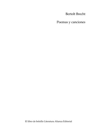 Este documento presenta la nota sobre la versión de Jesús López Pacheco de los poemas y canciones de Bertolt Brecht. Explica que la traducción fue un proceso colectivo que involucró a Vicente Romano y José María Carandell. También describe el enfoque ecléctico adoptado para traducir la variedad de formas poéticas de Brecht de manera que capturen el significado y tono originales. Finalmente, agradece la colaboración de los demás traductores en dar forma a esta versión.