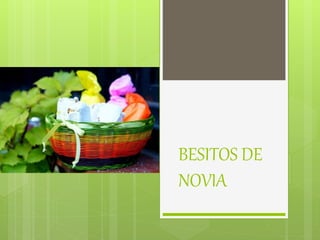 Este documento describe los besitos de novia, un biscocho cubierto de merengue con textura suave y forma rectangular. Está hecho de una masa de harina de trigo, huevos, leche y polvo para hornear horneada y luego cubierta con un merengue de claras de huevo y azúcar. Los besitos de novia se empacan en papel seda de colores para su venta.