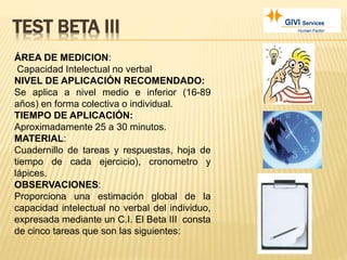 El documento proporciona información sobre la prueba Beta III, la cual evalúa la capacidad intelectual no verbal a través de 5 tareas. Cada tarea mide una habilidad diferente y tiene un tiempo de aplicación específico. El documento explica el proceso de aplicación de la prueba, las instrucciones para los examinadores, y los pasos para calificar y convertir las puntuaciones brutas en puntuaciones escalares corregidas por edad.