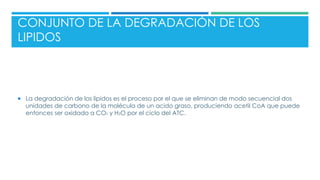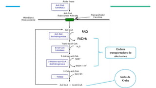 El documento describe el proceso de beta oxidación de los ácidos grasos, el cual ocurre en cuatro etapas cíclicas en la mitocondria y resulta en la formación de acetil-CoA. La beta oxidación es importante para producir energía cuando los niveles de glucosa son bajos. Primero, los ácidos grasos son transportados a la mitocondria y activados. Luego, cada ciclo de las cuatro reacciones (oxidación, hidratación, oxidación, tiolisis) acorta la cadena del ácido graso en dos carbonos formando