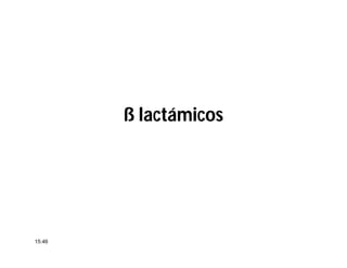 El documento clasifica los ß-lactámicos en penicilinas, cefalosporinas, carbapenems y monobactams. Describe las principales características de cada grupo, incluyendo ejemplos específicos, mecanismo de acción, espectro de actividad, farmacocinética y usos clínicos.