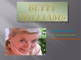 Este documento describe la biografía de Betty Williams, una activista irlandesa por la paz. Nació en Belfast en 1943, se educó en una escuela católica, trabajó como recepcionista y se casó en 1961. Se unió brevemente al Ejército Republicano Irlandés en 1972 pero luego decidió dedicarse a la paz. Fundó varios movimientos por la paz y recibió el Premio Nobel de la Paz en 1976 junto a Mairead Corrigan por su trabajo para resolver conflictos.