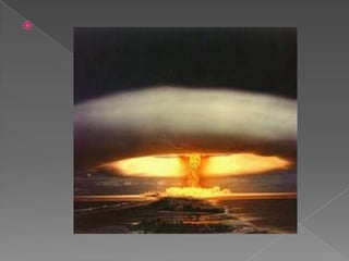 El documento habla sobre la bomba atómica. Explica que la primera bomba atómica fue desarrollada por Estados Unidos en 1945 y fue lanzada contra las ciudades japonesas de Hiroshima y Nagasaki. Describe que una bomba atómica obtiene energía de reacciones nucleares mediante la fisión de núcleos pesados que causa una explosión masiva. Los daños de una bomba atómica incluyen la destrucción del medio ambiente, altas tasas de mortalidad humana, y deformidades en los sob