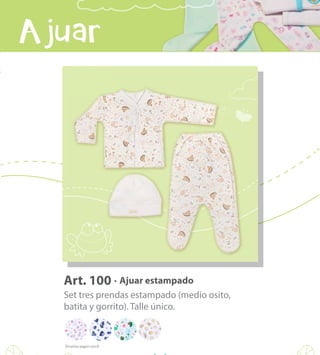 El documento presenta una lista de artículos de ropa y accesorios para bebés, incluyendo conjuntos, pijamas, baberos, mantas, sábanas y más. Cada artículo incluye una breve descripción y está identificado por un número. La lista parece ser el menú o catálogo de productos de una tienda o empresa dedicada a la ropa y accesorios para bebés.