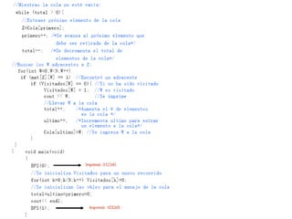 Este documento explica el algoritmo de búsqueda en anchura (BFS) para recorrer grafos. BFS comienza en el nodo raíz y explora todos los vecinos adyacentes, luego explora los vecinos de esos vecinos, repitiendo hasta recorrer todo el grafo. Se implementa usando una cola para almacenar los nodos por visitar, y se representa el grafo mediante una matriz o lista de adyacencia. El pseudocódigo muestra el proceso de BFS usando colores para marcar los nodos a medida