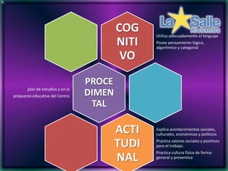 El documento describe los procesos del tercer año del bachillerato en ciencias en el Colegio La Salle en Riobamba, Ecuador. Incluye la malla curricular complementaria, el proceso de un nuevo rumbo cultural con 80 horas y proyectos sociales, y los parámetros de evaluación para el tutor y el tribunal. También cubre los exámenes escritos de grado en al menos 5 asignaturas con una calificación mínima de 12. Finalmente, cita un párrafo sobre la importancia de que la educación forme personas, trabajadores y ciudad