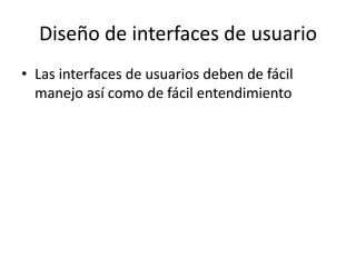 Las interfaces de usuario deben ser fáciles de usar y comprender para evitar errores del usuario. Deben adaptarse a las capacidades de los usuarios y no sobrecargar su memoria de corto plazo con demasiada información. También deben seguir principios como la familiaridad, uniformidad, recuperabilidad y diversidad de usuarios.