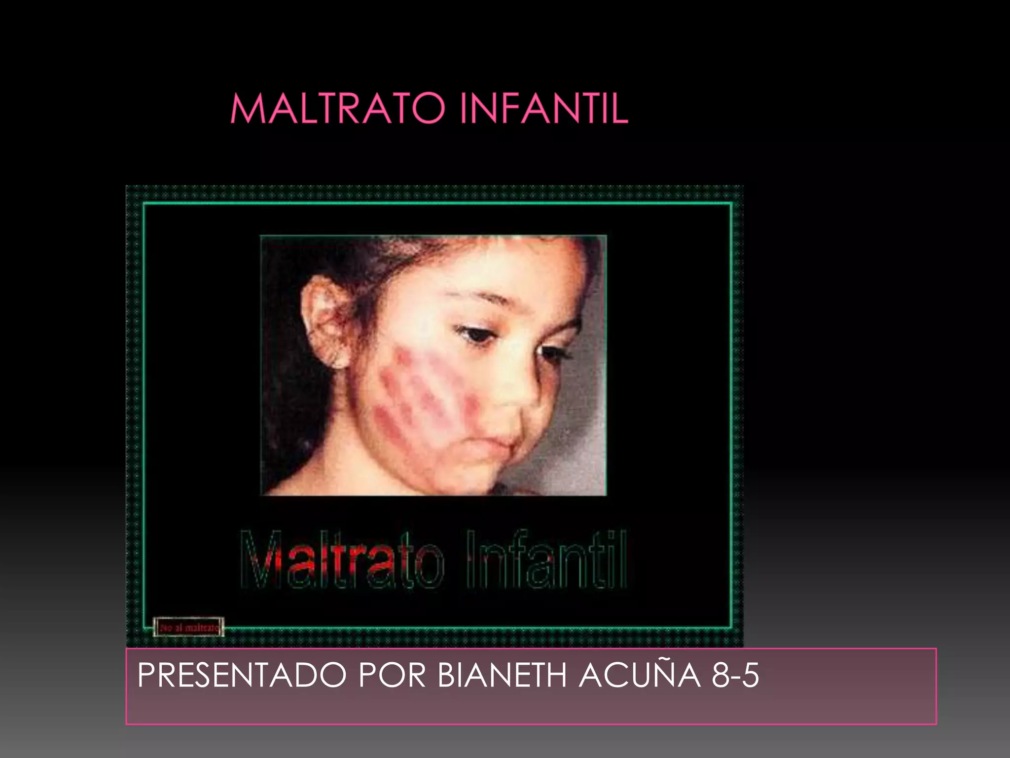 El documento define el maltrato infantil como cualquier acción u omisión no accidental por parte de los padres o cuidadores que cause daño físico o psicológico al menor y amenace su desarrollo. Señala que la violencia contra niños y niñas es un problema extendido en todos los estratos sociales y puede afectar a más de la mitad de los niños en el mundo. Enumera cinco tipos de maltrato: abuso físico, abuso sexual, maltrato emocional, abandono físico y abandono emocional.