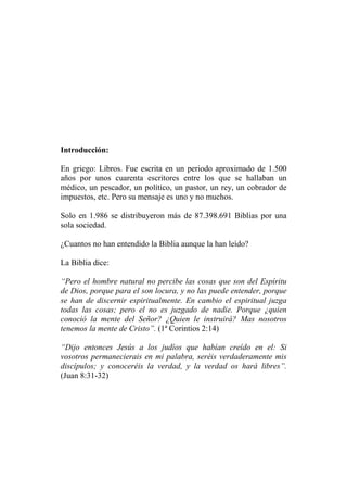 Este documento presenta varias evidencias de que la Biblia es la palabra de Dios, incluyendo su exactitud histórica y científica, la armonía entre los diferentes autores a lo largo de 1500 años, el cumplimiento de profecías, e impacto positivo en las personas. Argumenta que la Biblia no puede ser el producto de mentes engañadas o de Satanás, y que su mensaje superior satisface las necesidades humanas de una manera que ningún otro libro puede igualar.