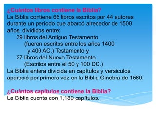 La Biblia contiene 66 libros escritos por más de 40 autores a lo largo de 1500 años, divididos en el Antiguo y Nuevo Testamento. Consta de 1,189 capítulos y 31,103 versículos, y fue escrita originalmente en hebreo, arameo y griego. La Biblia ha sido traducida a más de 2000 idiomas y sigue siendo el libro más vendido en todo el mundo.