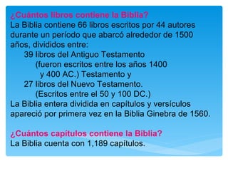 La Biblia contiene 66 libros escritos por alrededor de 40 autores a lo largo de 1500 años, divididos en el Antiguo y Nuevo Testamento. Fue escrita originalmente en hebreo, arameo y griego y ha sido traducida a más de 2000 idiomas, siendo el libro más traducido y vendido en la historia.