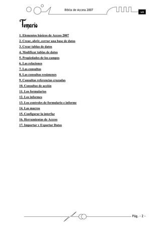 Este documento describe los elementos básicos de Access 2007, incluyendo cómo crear, abrir y cerrar una base de datos, crear tablas y consultas, y los diferentes tipos de objetos como formularios, informes y macros. También explica conceptos clave como tablas, campos, registros, y cómo usar el panel de exploración y las barras de herramientas.