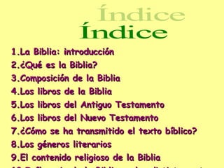 El documento resume la Biblia, incluyendo que está compuesta de 73 libros divididos en el Antiguo y Nuevo Testamento. Explica que la Biblia comenzó a escribirse hace unos 3,000 años y contiene diferentes géneros literarios como histórico y profético. También influyó en el arte, literatura y cultura occidental.