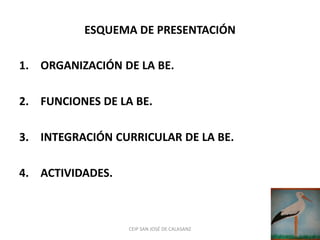 Este documento describe la biblioteca del colegio público CEIP "San José de Calasanz". El colegio tiene 253 estudiantes y 20 maestros. El documento detalla la organización y funciones de la biblioteca escolar, incluyendo la clasificación de los fondos, el equipo de biblioteca, y las actividades para promover el hábito de la lectura entre los estudiantes.