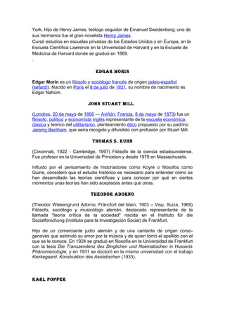 Los documentos presentan información biográfica y académica sobre diversos filósofos, científicos y pensadores como David Hume, Auguste Comte, Francis Bacon, William James, Edgar Morin, John Stuart Mill, Thomas Kuhn, Theodor Adorno, Karl Popper, Herbert Marcuse, Erich Fromm, Imre Lakatos, Paul Feyerabend y Ludwig Wittgenstein.