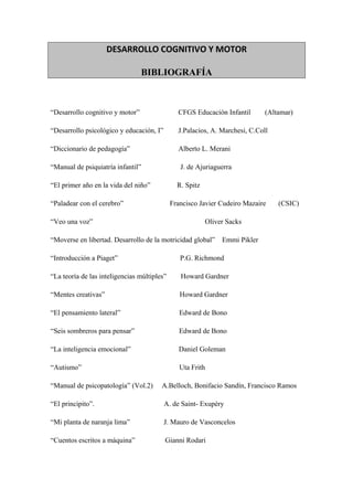 El documento lista referencias bibliográficas sobre desarrollo cognitivo y motor infantil, teorías de la inteligencia como las de Gardner y Piaget, pensamiento lateral, inteligencia emocional, autismo, y libros infantiles clásicos.