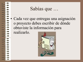 Este documento explica cómo hacer bibliografías y proporciona ejemplos de cómo citar diferentes fuentes como libros, revistas, periódicos y páginas web. Explica que una bibliografía es una lista de todas las fuentes utilizadas para un trabajo o proyecto y menciona tres estilos comunes para bibliografías: MLA, Turabian y APA. Luego proporciona ejemplos detallados de cómo citar diferentes tipos de fuentes siguiendo el formato APA.
