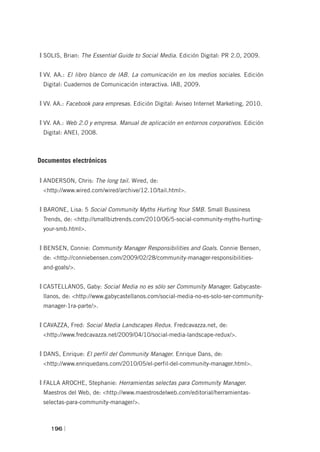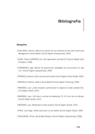 Este documento presenta una bibliografía de varios recursos sobre marketing en redes sociales y gestión de comunidades online, incluyendo libros, documentos electrónicos y artículos web. La bibliografía incluye obras de autores como Brian Solis, Juan Merodio, Chris Anderson y otros expertos en el tema.