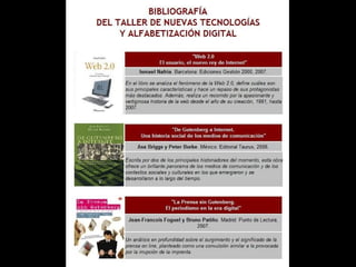 El documento es una bibliografía para un taller sobre nuevas tecnologías y alfabetización digital que forma parte de un diplomado sobre estrategias integradas de comunicación y marketing. El taller se centra en el poder del mensaje y cómo utilizar diferentes canales y plataformas para transmitir un mensaje de manera efectiva.