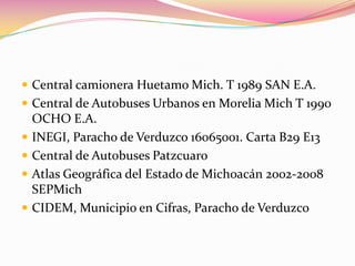 El documento proporciona una bibliografía de varias fuentes que contienen información sobre centrales de autobuses y terminales de transporte en Michoacán, México, incluyendo Paracho de Verduzco. Las fuentes incluyen libros, periódicos, sitios web gubernamentales y no gubernamentales que contienen datos demográficos, planes de desarrollo, normas de transporte y más.